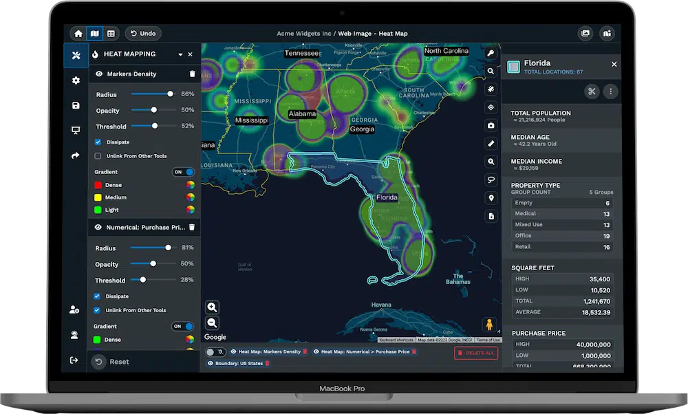 - Built-in heat maps, drive-time, and demographic overlays for quick analysis
