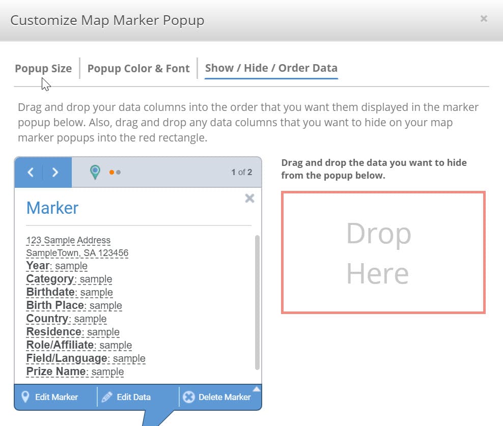 Customize the look of the popup that appears when you click on your markers. To do this, access the “Map Markers / Graphics” menu and open the “Customize Marker Popups” option.