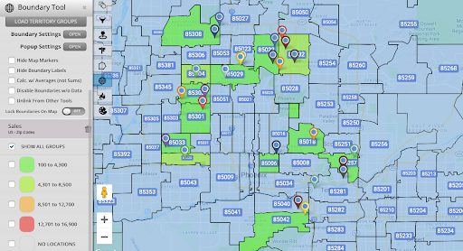 Want to see your data based on zip code? Maptive’s boundary tool draws zip code boundaries for a zoomed-in view and localized data analysis. Zip code boundaries provide a granular view of your data. For example, when combined with your sales data or Maptive’s built-in population data from the U.S. census, they make insightful heat maps or sales density maps.