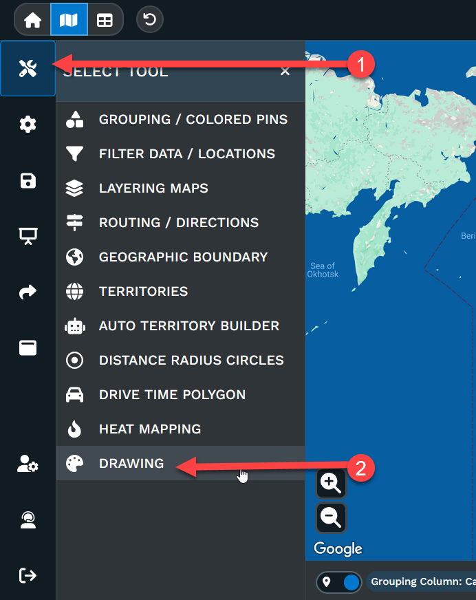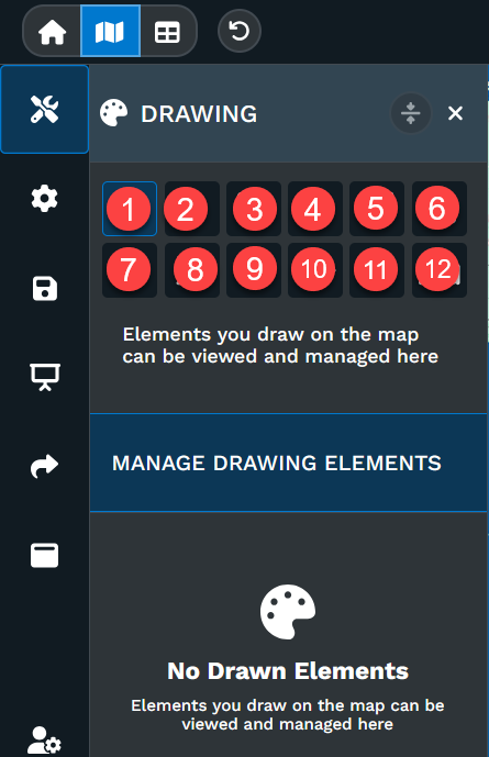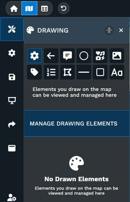 Go to Map Tools in your dashboard and select Drawing. A toolbar appears with arrows, callouts, shapes, labels, and more.