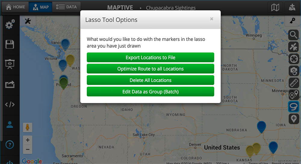 Use the Map Lasso Tool to select multiple data points and locations at once. Then, easily make changes to your selected locations and perform batch actions to save time and work on your map more efficiently.