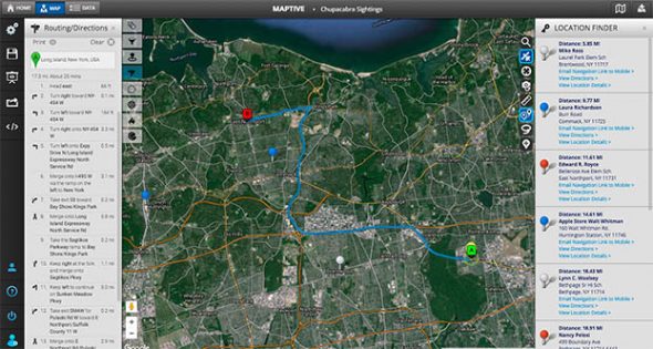 Once the location search is finished, the details about the locations will be displayed along the right side of the map. This will include the distance to your location, the store name, address, and links that will help you find directions to the store using Maptive or Google maps.