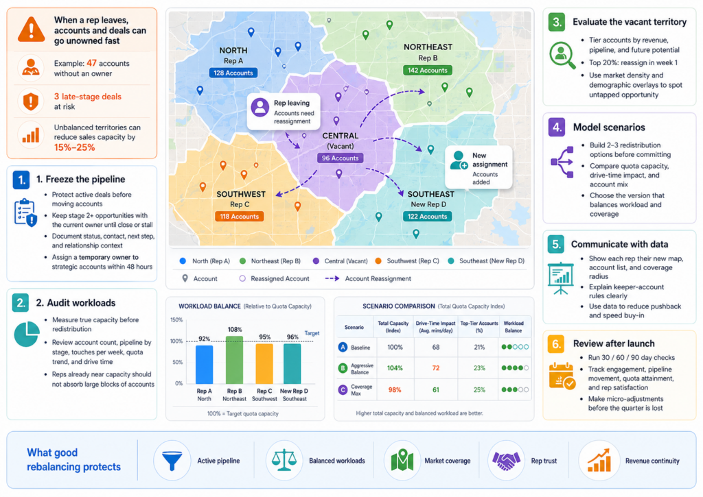 The vacant territory may contain untapped potential that the departing rep never developed. Before redistributing, overlay demographic data, business density, and industry concentration against the account list. If the territory contains 500 businesses matching your ideal customer profile but the departing rep only had 47 active accounts, the rebalance is an opportunity to expand coverage, not merely backfill.