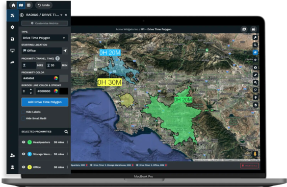 | Drive Time Mapping | Generate drive time polygons up to 8 hours using live traffic data and actual road networks. Maptive iQ uses 300% more calculation points than previous versions. Define service areas based on real-world driving conditions instead of simple radius circles. |