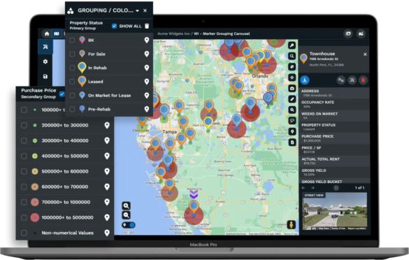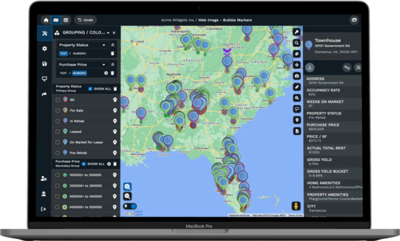 Color-code markers by one field while sizing by another. Multi-variable grouping reveals patterns that single-dimension maps miss entirely.