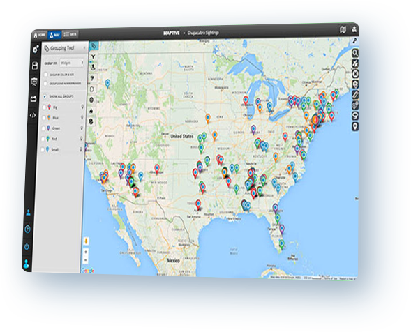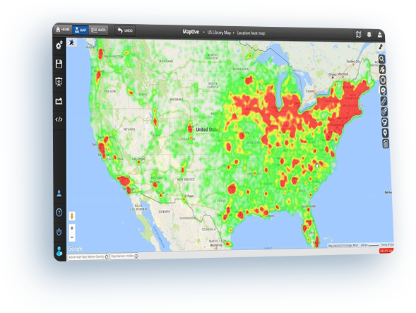 Maptive provides hundreds of features that let you view your spreadsheet data in completely new ways. Below is just a sampling of what is possible. If you have a specific type of map you want, feel free to view all our features or ask us a question using the button at the bottom right-hand corner of the screen.