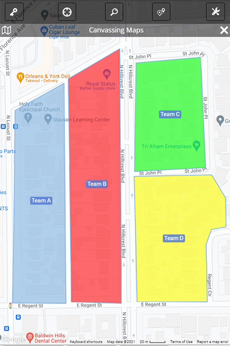 Political canvassing maps visualize your target voter’s data, district’s demographics, and campaign’s goals over detailed maps, allowing you to create targeted in-the-field strategies, discover opportunities, and efficiently coordinate your team of canvassers.