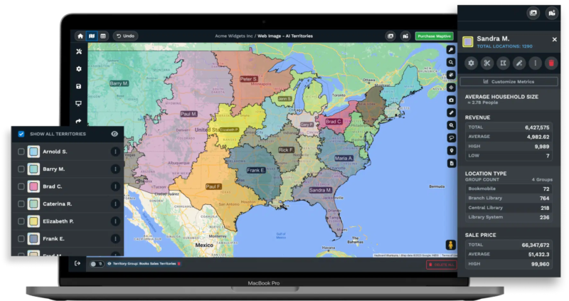 Maptive’s territory tools let you build regions from preset boundaries like zip codes, cities, or states. You can also draw custom territories when the standard shapes do not fit your needs. Add secondary criteria such as population, income levels, or demographic data to balance workloads and spot opportunities.