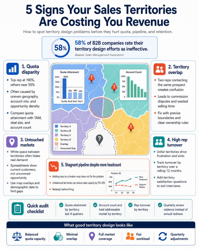The 5 signs below show up in pipeline data, turnover rates, and quota attainment reports long before anyone labels them as territory problems. Catching them early is the difference between a fixable structural issue and a quarter you cannot recover.