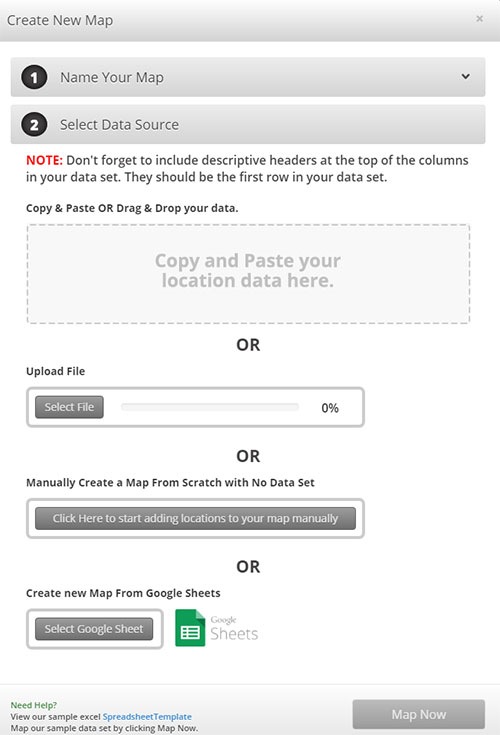 Step 3: Click the green “Map Now” button to view your map. Your locations will now be plotted on a beautiful interactive map.